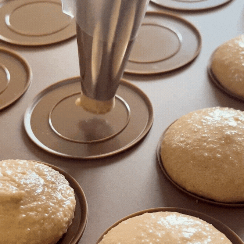 Ustensiles : thermomètre, tapis à macaron en silicone, poche à douille, douille unie ronde 10mm, corne.